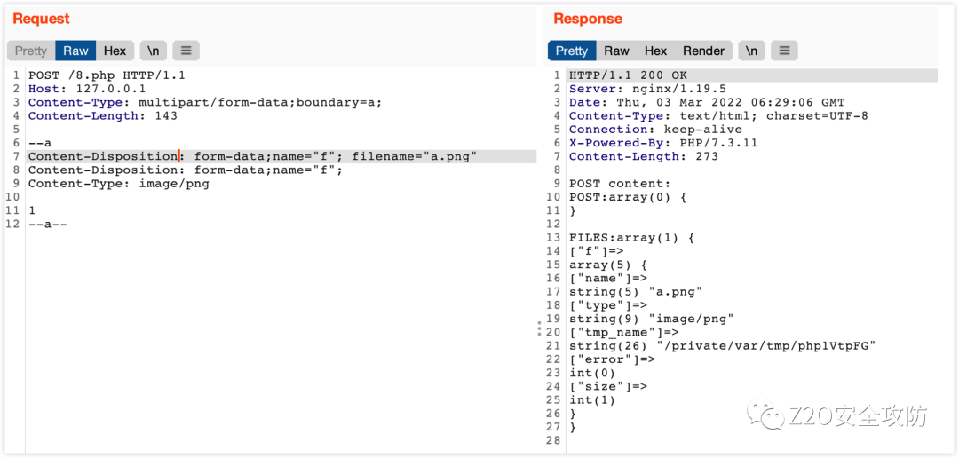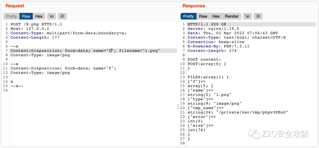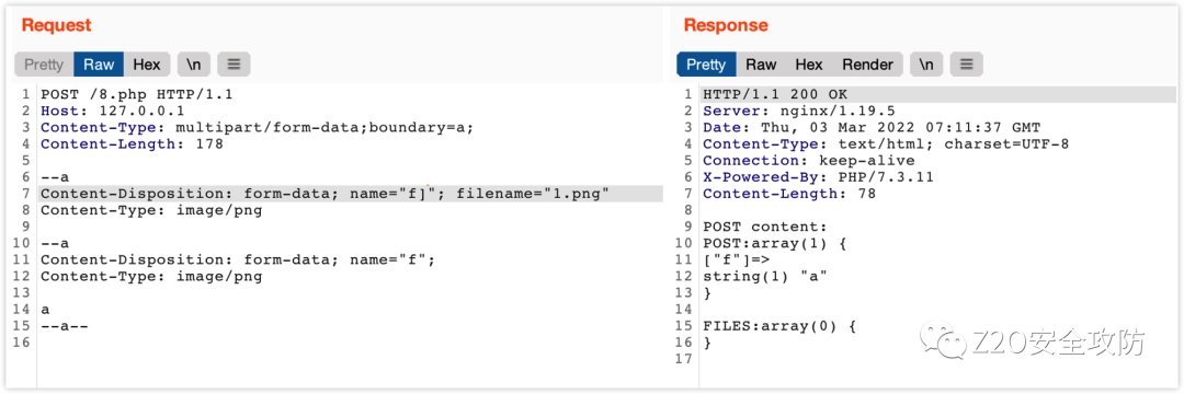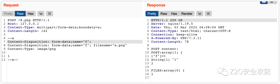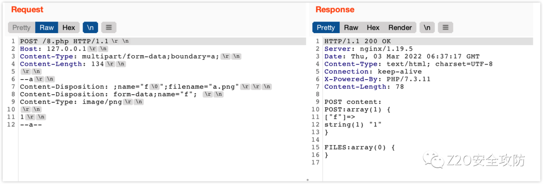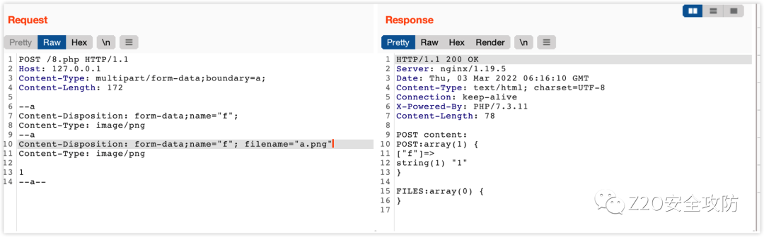 可以看到,实际上和前一种urlencoded是达到了同一种效果,参数并没有进入$_FILES数组,而是进入了$_POST数组。那么,何时是上传文件?何时是POST参数呢?这个关键点在于有没有一个完整的filename=。这9个字符是经过反复测试的,缺一个字符不可,替换一个字符也不可,在其中添加一个字符更不可。