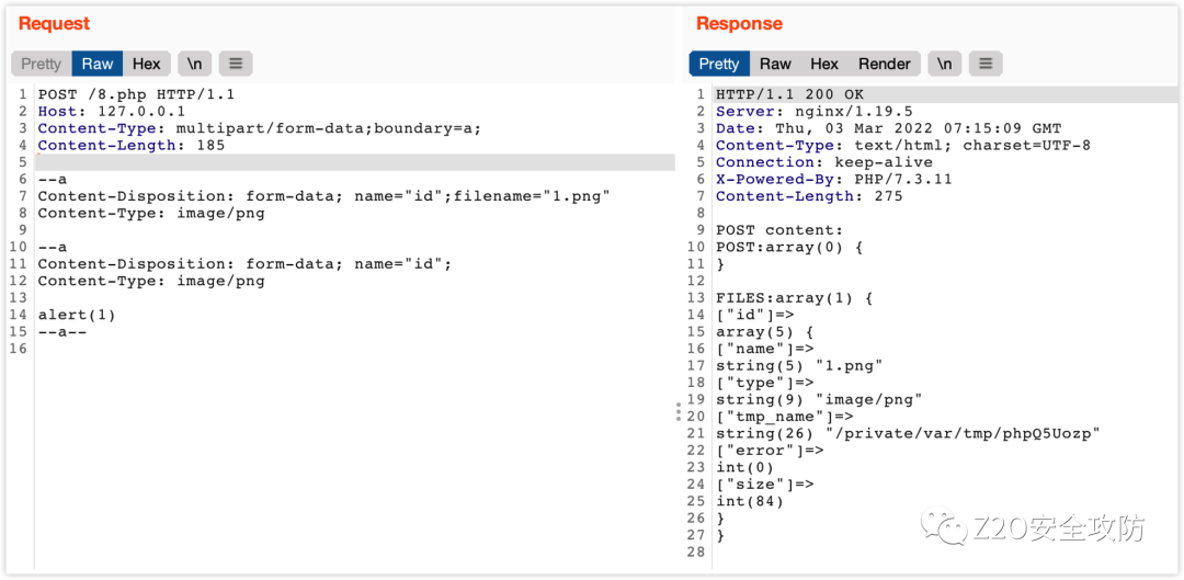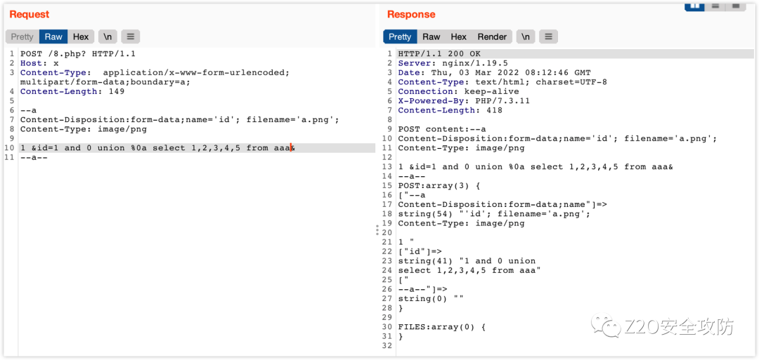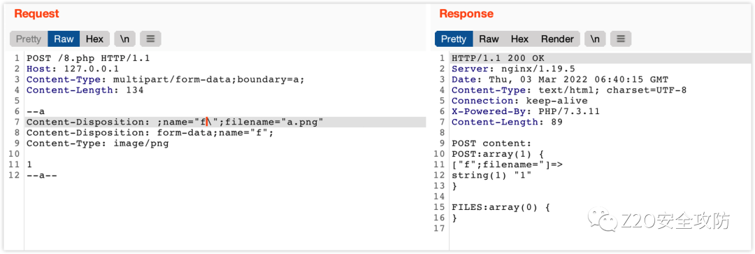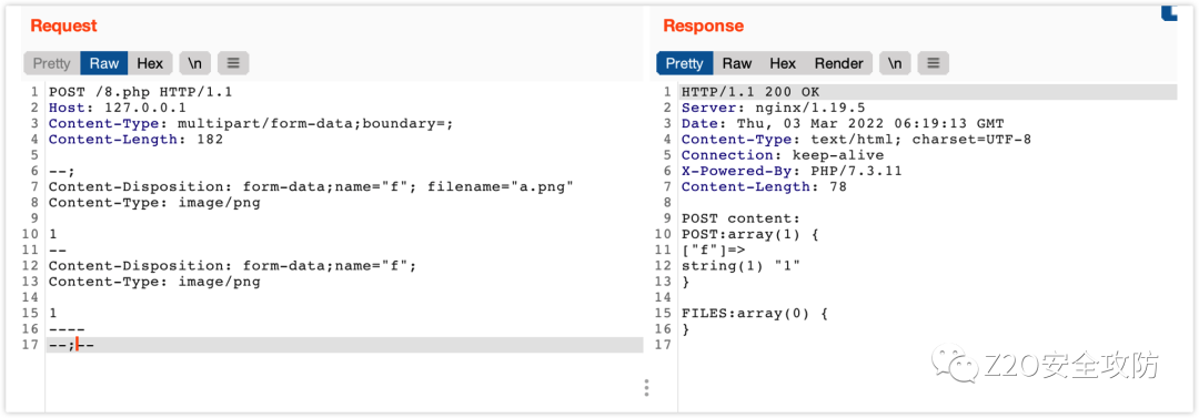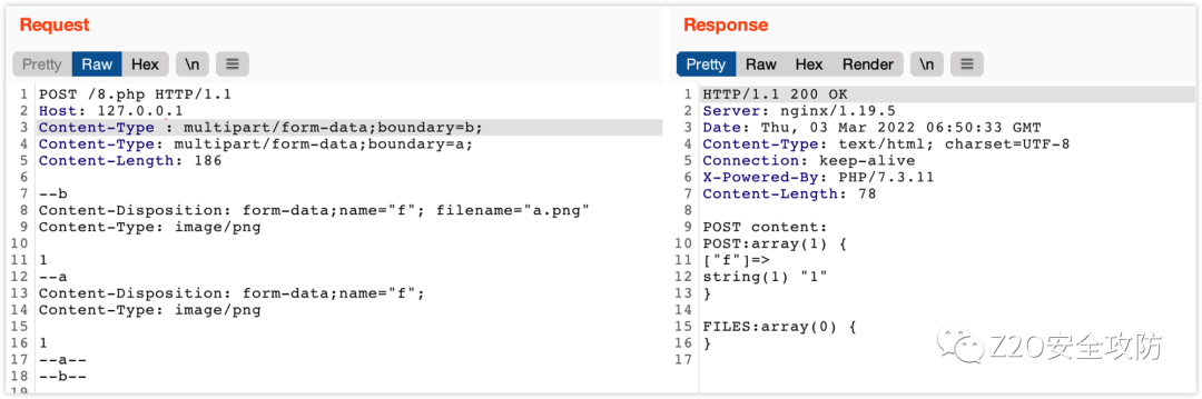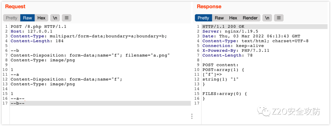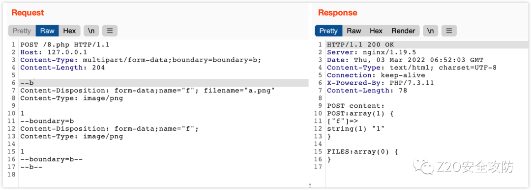 我们知道,HTTP协议POST请求,除了常规的application/x-www-form-urlencoded以外,还有multipart/form-data这种形式,主要是为了解决上传文件场景下文件内容较大且内置字符不可控的问题。multipart/form-data格式也是可以传递POST参数的。对于Nginx+PHP的架构,Nginx实际上是不负责解析multipart/form-data的body部分的,而是交由PHP来解析,因此WAF所获取的内容就很有可能与后端的PHP发生不一致。