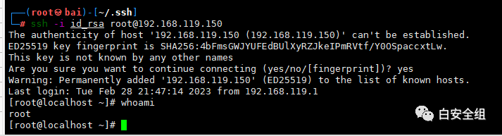 ssh -i id_rsa root@192.168.119.150当然这个是在攻击机器中的.ssh文件夹中,利用id_rsa进行连接