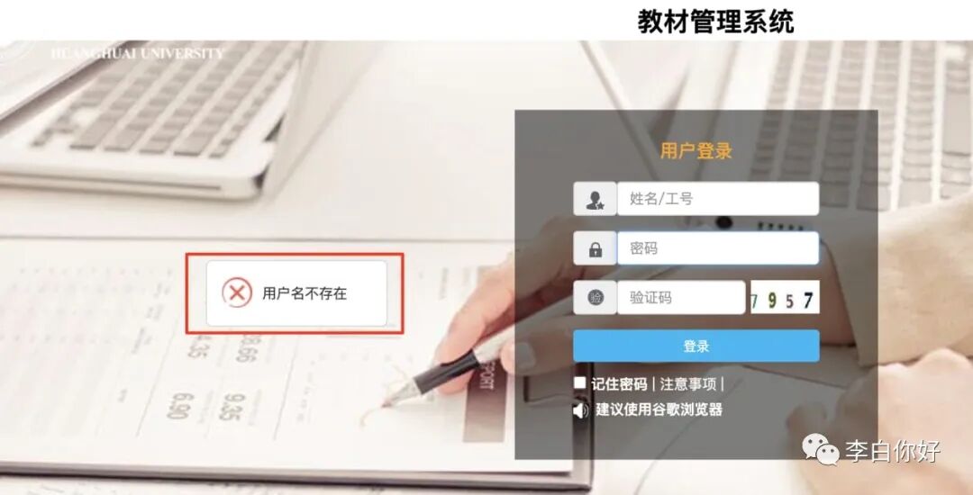 打开之后是一个登录页面,输入admin发现不存在用户名,他是那种先检测用户名是否存在再去输入密码的一种机制,如图:密码123456直接就登录进去,本以为是个测试账号,没有什么上传点之类的,登录进去之后发现有头像上传和教材查询,后面跑了跑注入发现存在一个布尔的注入,但是准备跑用户直接把网站跑死了😅...!