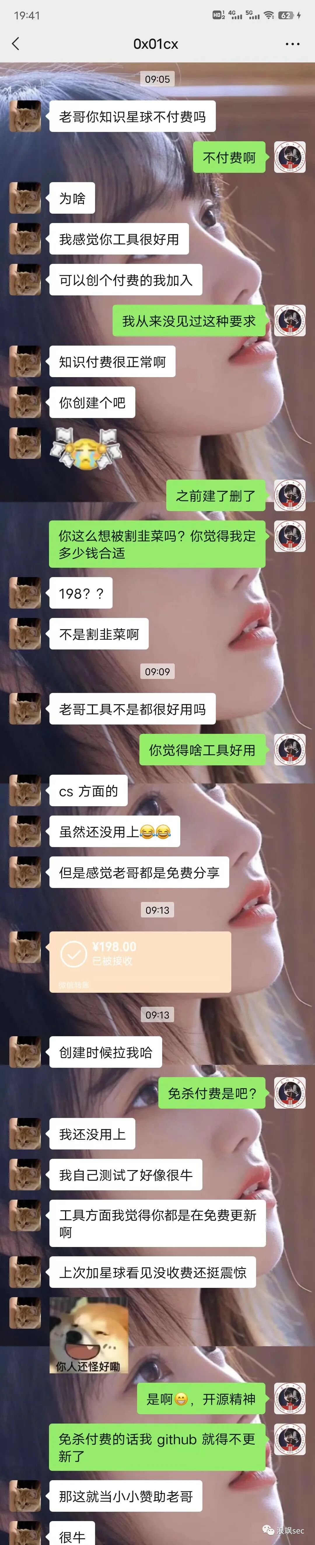 决定整一个免杀付费群,想进找我就行,就如下面孩子说的价格,后续可能因为群里人太多影响社群质量涨价。为了不让赞助的孩子寒心,决定创个这么群,比github更新早以及其他随机东西,也不希望有不好的人进来,毕竟不缺这几千块,本人也菜,教不了太多的东西。