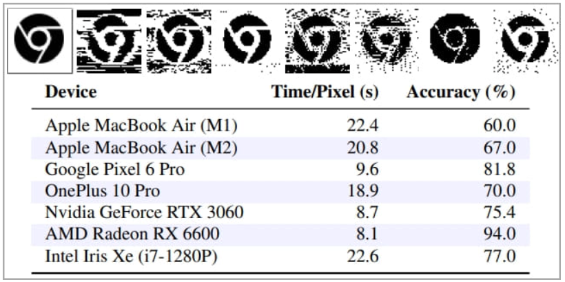 研究人员在苹果M1芯片、谷歌Pixel 6 Pro设备中的Cortex-X1 Arm芯片、OnePlus 10 Pro设备中的高通Snapdragon 8 Gen 1芯片设备上进行了实验,并成功将热消耗极限与不同的频率和电量消耗度量的工作负载进行了关联。然后,对苹果M1 和M2芯片、AMD Radeon RX 6600、Nvidia GeForce RTX 3060, 和Intel Iris Xe芯片上进行了测试。研究人员分析了不同的处理行为如何影响电量消耗、温度和频率,并使用这些数据作为基础来评估Hot Pixels攻击。