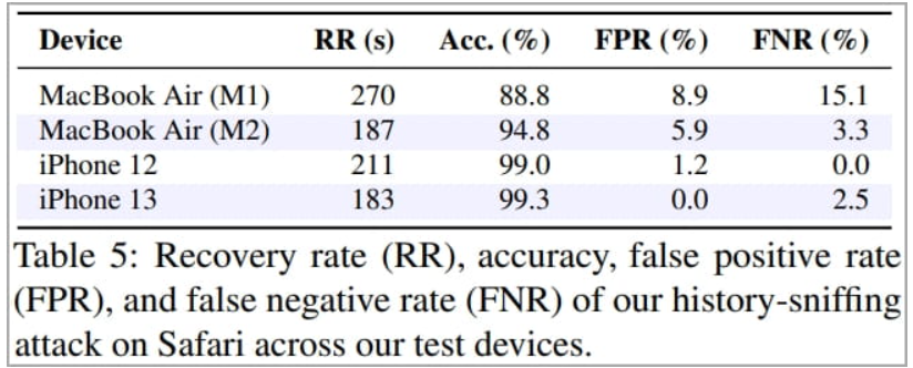 该攻击在iPhone 13手机上的准确率为99.3%,平均50个链接的信息恢复时间为183秒。