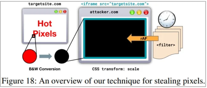 美国佐治亚理工学院、密歇根大学和德国波鸿鲁尔大学研究人员提出一种新型攻击方法——Hot Pixels,可以提取目标浏览器上展示的内容像素,并推断出浏览历史。该攻击利用了主流芯片系统(SoC)和GPU上的依赖数据的计算次数,并用来隐秘地窃取Chrome和Safari浏览器上访问过的web页面信息。