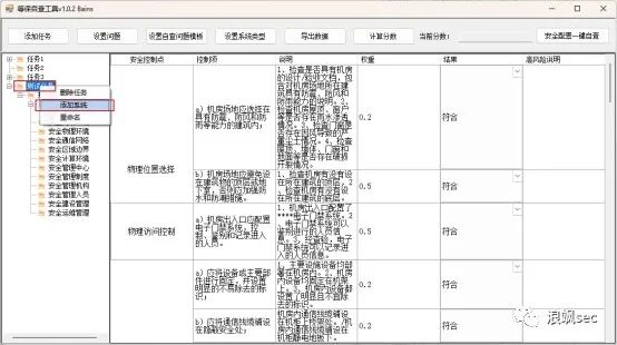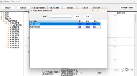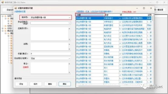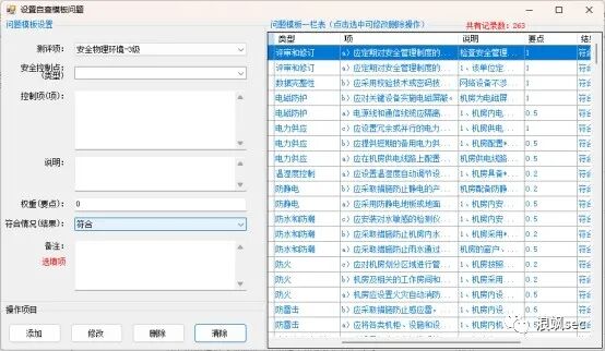 点击设置自查问题模板会出现设置自查问题模板,测评项就是在前面设置问题添加的,选择测评项,填写类型、控制项、说明、权重等就可以添加模板了。修改和删除需要双击右边表格里的内容,清除是清除左侧当前填写的内容。