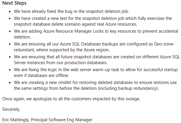 Mattingly解释说,Azure DevOps工程师偶尔需要对生产数据库进行快照,以便调查客户升级或评估潜在的性能改进。为了确保这些快照数据库得到清理,每天都会运行一个超过特定期限便会将其删除的后台作业。在最近一个敏捷开发的冲刺中,Azure DevOps工程师执行了一个代码升级,用受支持的Azure.ResourceManager.* NuGet包替换已弃用的Microsoft.Azure.Managment.*包。这导致了一个大的拉取请求,交换了旧包中的API调用和新包中的API调用。拼写错误就隐藏在这个拉取请求中,该错误将删除Azure SQL数据库的调用替换成删除托管数据库的Azure SQL Server的调用。由于错误的代码只在特定条件下运行,因此没能被现有测试覆盖。根据Mattingly的事件报告,在将Sprint 222部署到Ring 0(微软的内部Azure DevOps 组织)时,由于其中不存在任何快照数据库,所以没有执行删除作业。几天后,软件更改被部署到南巴西的客户环境Ring 1。该环境中存在能够触发错误的快照数据库,导致后台作业删除了整个Azure SQL Server和所有17个生产数据库。自此不再能处理任何客户流量,所幸数据并未丢失。在此次事件后,微软表示会采取一系列措施以避免未来发生类似的问题,例如确保所有快照数据库创建在不同的Azure SQL Server上,以避免与生产数据库冲突。在别人的网站文件里面放入网页木马或者是将代码潜入到对方正常的网页文件里,以使浏览者中马。