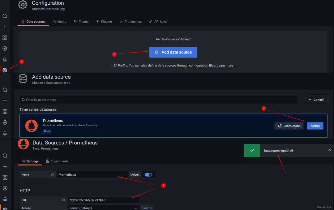 登录成功后点击设置图标,默认进入数据源管理页面,点击【ADD data source】,选择数据源Prometheus,填写URL地址,其它项都可以默认,点击【Save&test】