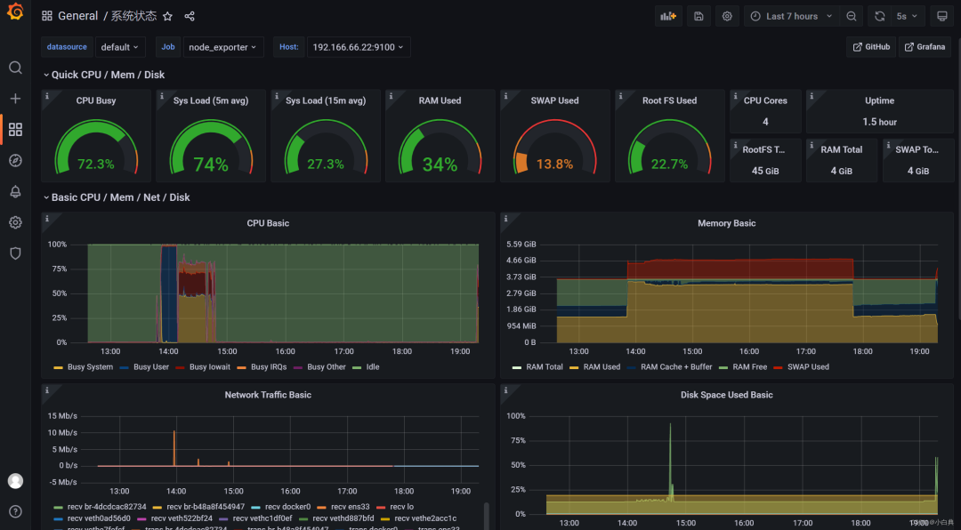 之后就能够看到漂亮的页面展示啦,设置好同步时间,然后使用压测工具对服务器进行压测,图表就会同步更新啦,如下图所示,开始压测后CPU、内存、磁盘等数据开始升高。