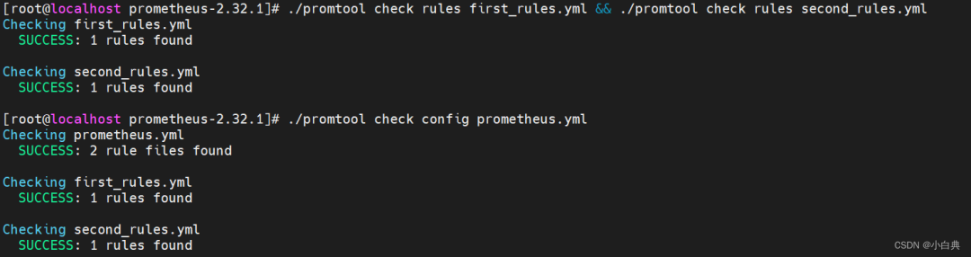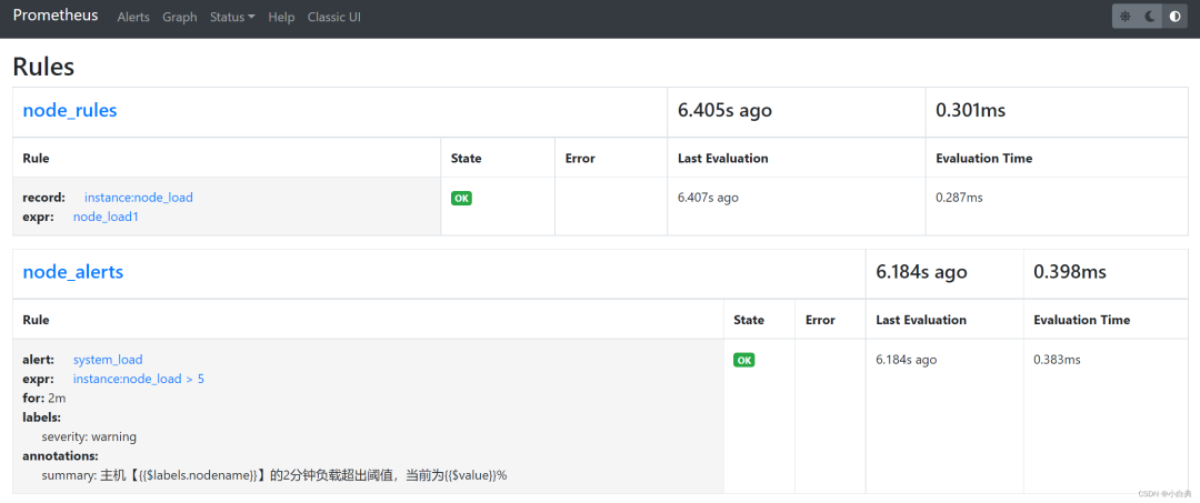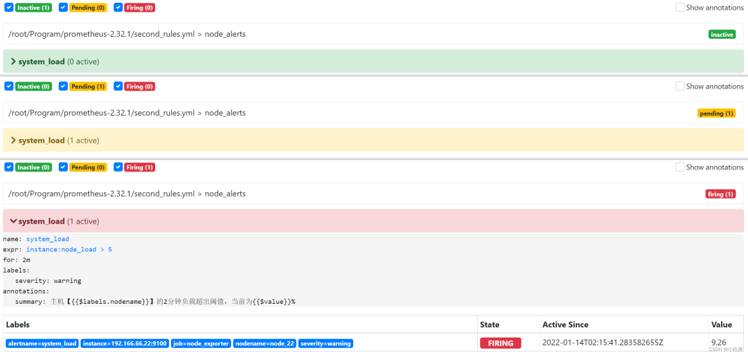 ./promtool check config prometheus.yml或./promtool check rules first_rules.yml检查规则配置是否正确。【Status】→【Rules】,可以看到配置的规则。使用Stress工具或其它压测工具进行负载测试,在Prometheus的Web告警页面可看到状态变化,满足规则要求就会收到告警邮件。