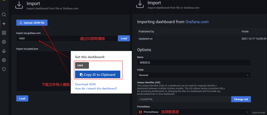 添加数据源之后,创建DashBoard,可自定义,官方也提供了很多的漂亮的仪表盘供选择,所以直接导入即可使用,通过仪表盘ID或下载文件后导入。