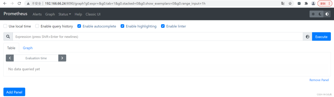配置正确则浏览器可成功访问到9090端口的地址,访问http://192.166.66.24:9090/出现下图界面,点击【Status】→【Targets】,prometheus应处于UP状态。
