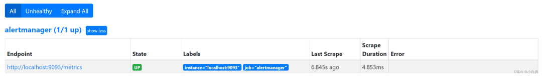 在Prometheus的Web页面,点击【Status】→【Targets】,可以看到新增alertmanager服务并处于up状态。