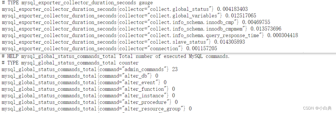 最后重启supervisor:systemctl restart supervisord.service,查看mysqld_exporter的状态,应处于UP状态,访问http://192.166.66.22:9104/metrics也能获取MySQL的指标,数据中有如下查询语句相关的数据才是正确的。