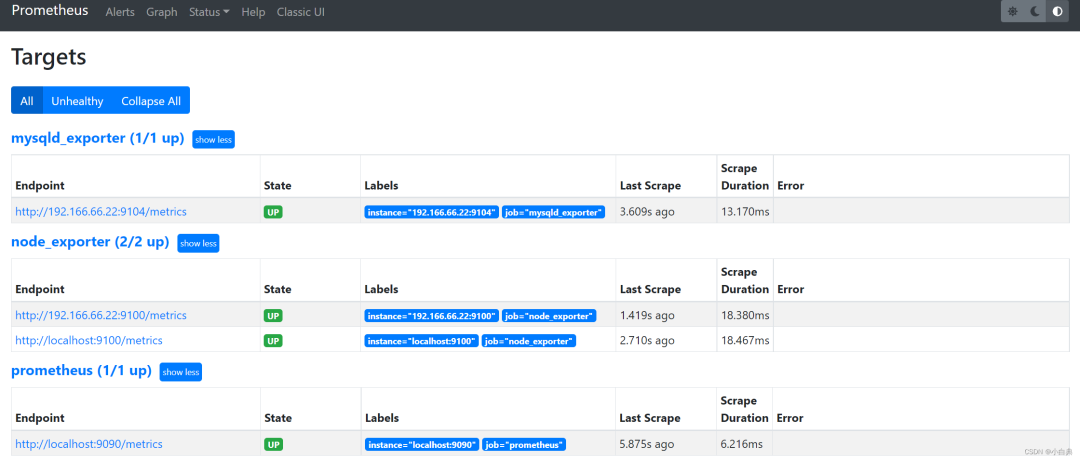 浏览器访问Prometheus地址http://192.166.66.24:9090/,点击【Status】→【Targets】,查看服务状态,全部处于UP状态。