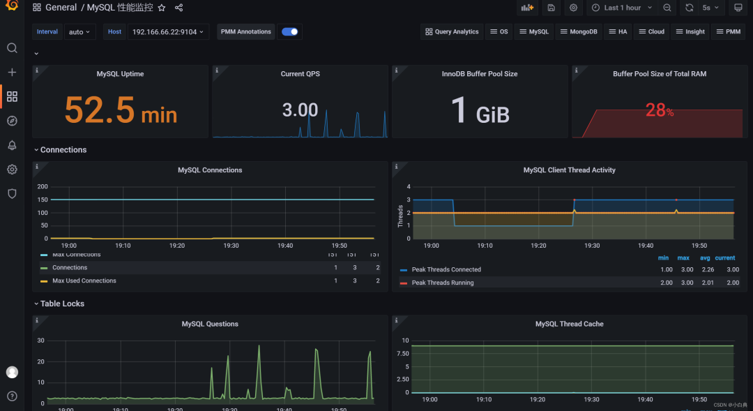 对于MySQL数据图形化展示也是相同的步骤,直接搜索模板导入即可使用,如下图所示,每次数据请求,面板图表展示都会有变化。