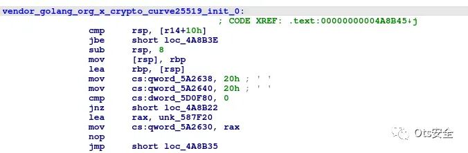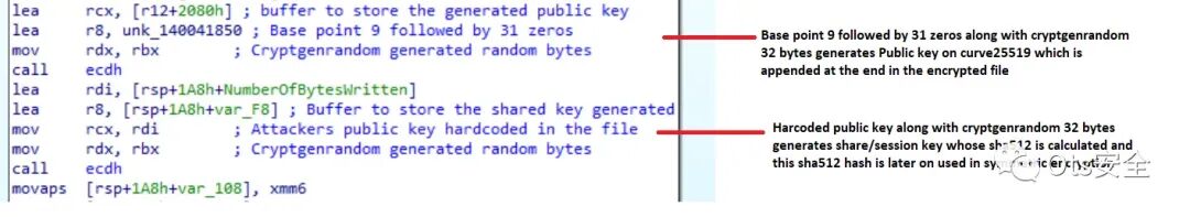 ECDH 中的共享密钥/会话密钥现在通过 Curve25519 生成,使用步骤 2 中的私钥和文件中硬编码的攻击者公钥。在 Windows 中,Curve25519 加密是静态实现的,这使得逆向工程变得困难。Golang 库 Curve25519 在 Linux 中使用。