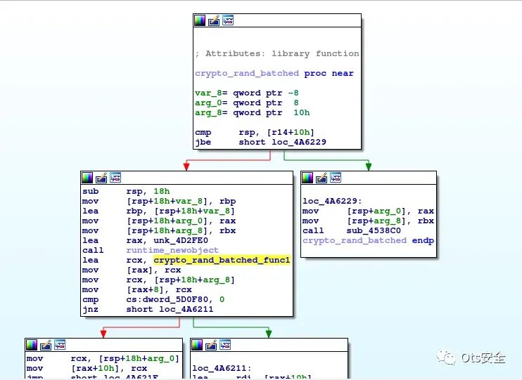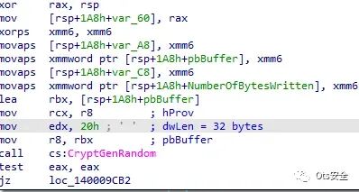 然后调用Cryptgenrandom以用加密随机 32 字节填充缓冲区,在步骤 1 中获得的句柄作为参数传递。(在 Linux 中,图 14 中突出显示的crypto_rand_batched Golang 库用于生成 32 个随机字节。)