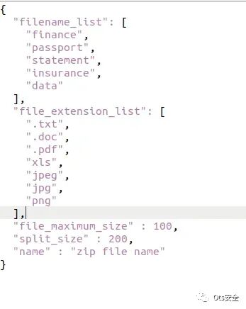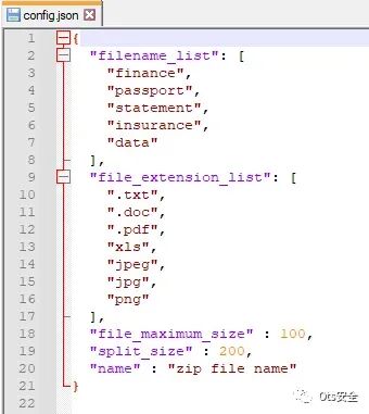 之后,窃取者读取其执行时位于同一目录中的config.json文件。它包含文件名列表以及相应的扩展名和大小。