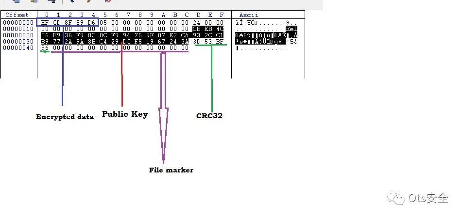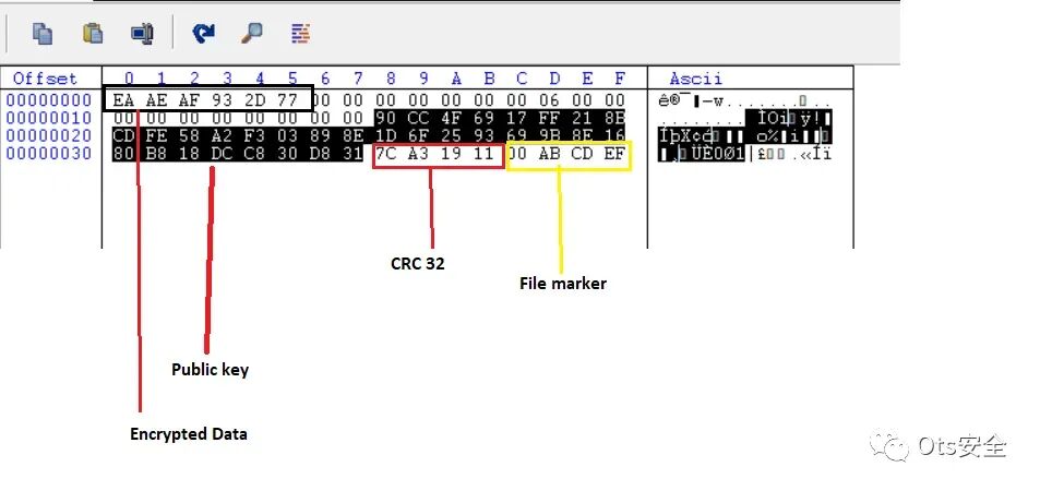 使用公钥在 Windows 和 Linux 中加密后,CRC32 和文件标记将附加到文件末尾。用于标识文件是否已经加密(以免重复加密),Linux文件标记为00ABCDEF,而在Windows中为0000000000000000000000000。