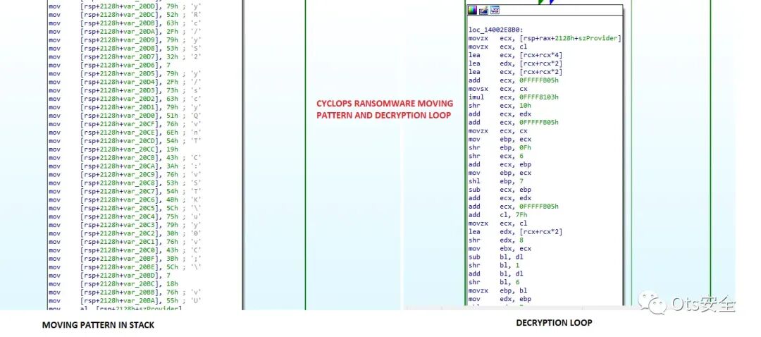 图 32 - Cyclops 勒索软件中的堆栈字符串混淆