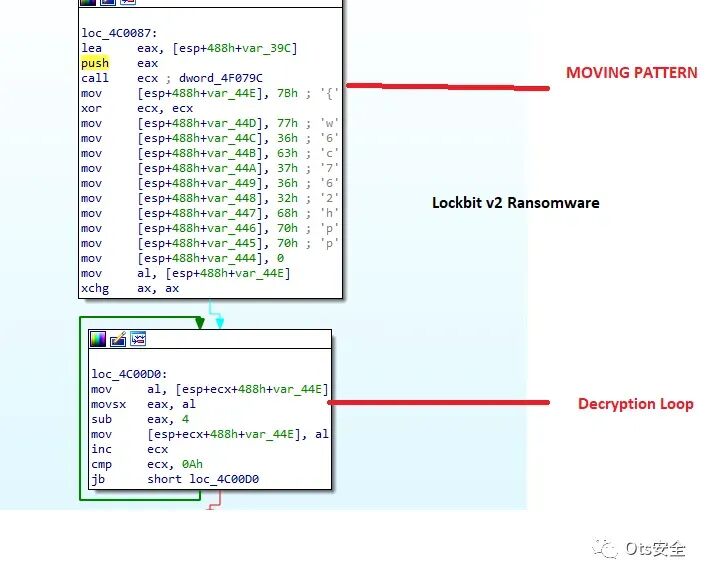 图 33 - Lockbit v2 勒索软件中的堆栈字符串混淆