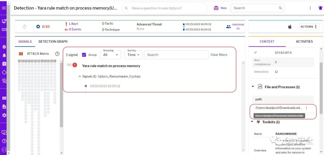 鉴于我们的平台配备了 YARA 进程扫描和高级检测,Uptycs XDR 客户端可以轻松扫描 Linux 和 Macintosh 勒索软件。