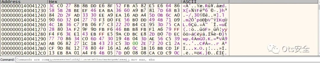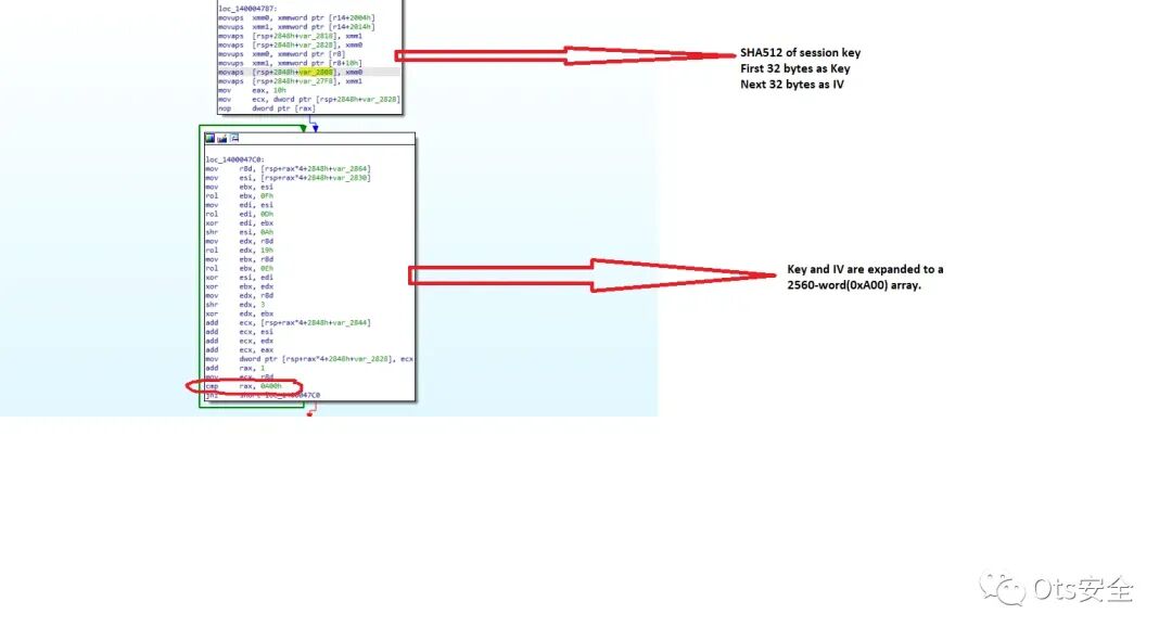 这里使用的对称加密是 HC-256(一种流密码)。它将生成的 SHA512 的前 32 个字节作为密钥,将生成的 512 的后 32 个字节作为初始化向量 (IV)。图 20 显示了密钥和 IV 如何扩展为 2560 字 (0xA00) 的数组。
