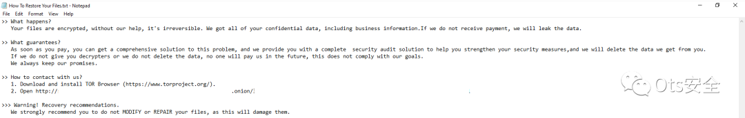 赎金记录消息指向一个 Onion 站点,受害者可以访问该站点以恢复其加密文件。