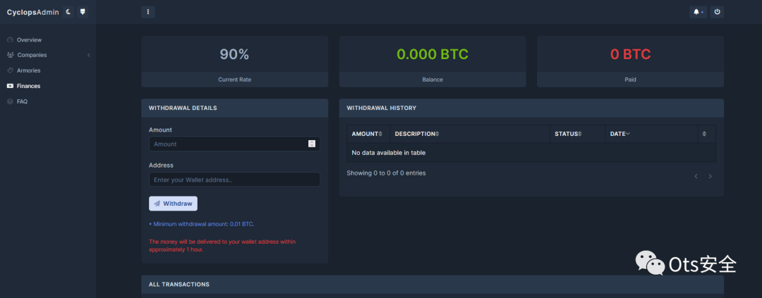 作为一种银行,该网站包括一个金融部分,为 Cyclops 攻击者提供发起提取已付赎金金额的能力。