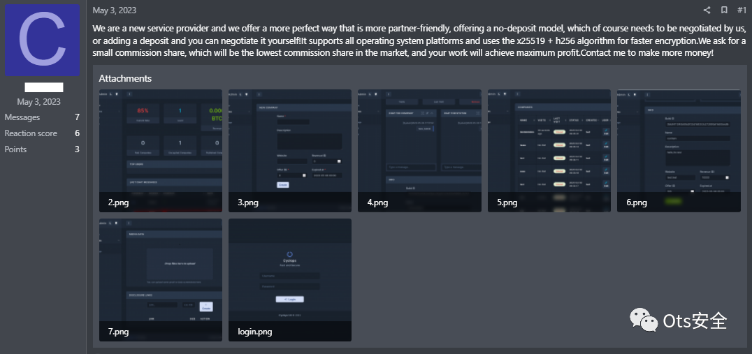 此 RaaS 背后的威胁行为者在论坛上推广其产品。它在那里要求那些使用其恶意软件从事恶意活动的人分享利润。
