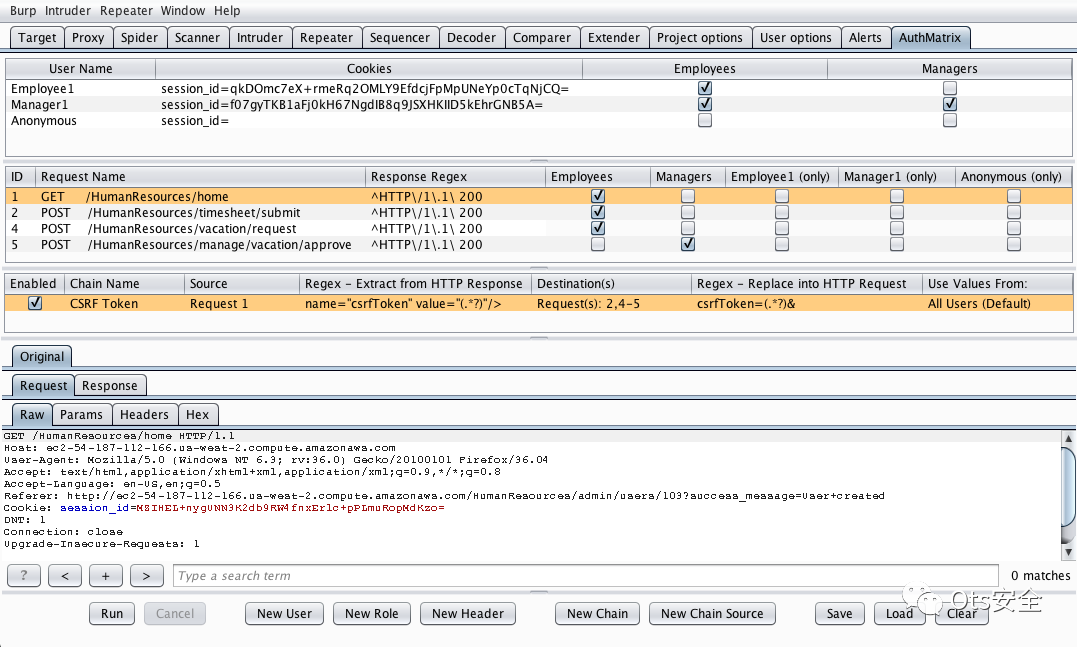 AuthMatrix 是 Burp Suite 的扩展,它提供了一种简单的方法来测试 Web 应用程序和 Web 服务中的授权。使用 AuthMatrix,测试人员专注于预先为特定目标应用程序彻底定义用户、角色和请求表。这些表的结构与各种威胁建模方法中常见的访问控制矩阵的格式类似。