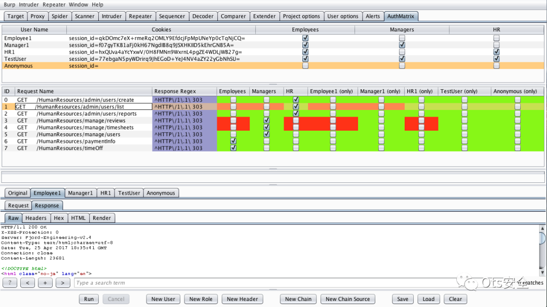 一旦表格被组装好,测试人员就可以使用简单的点击运行界面来启动所有角色和请求的组合。结果可以通过一个易于阅读的彩色编码界面来确认,该界面指示在系统中检测到的任何授权漏洞。此外,该扩展提供了保存和加载目标配置以进行简单回归测试的能力。