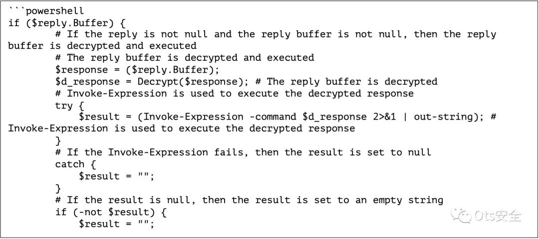PowerDrop 随后将以加密命令的形式接收来自 C2 服务器的响应。然后,植入程序将解密命令,去除前置和后置值,并使用 PowerShell 中的 Invoke-Expression cmdlet 执行命令。