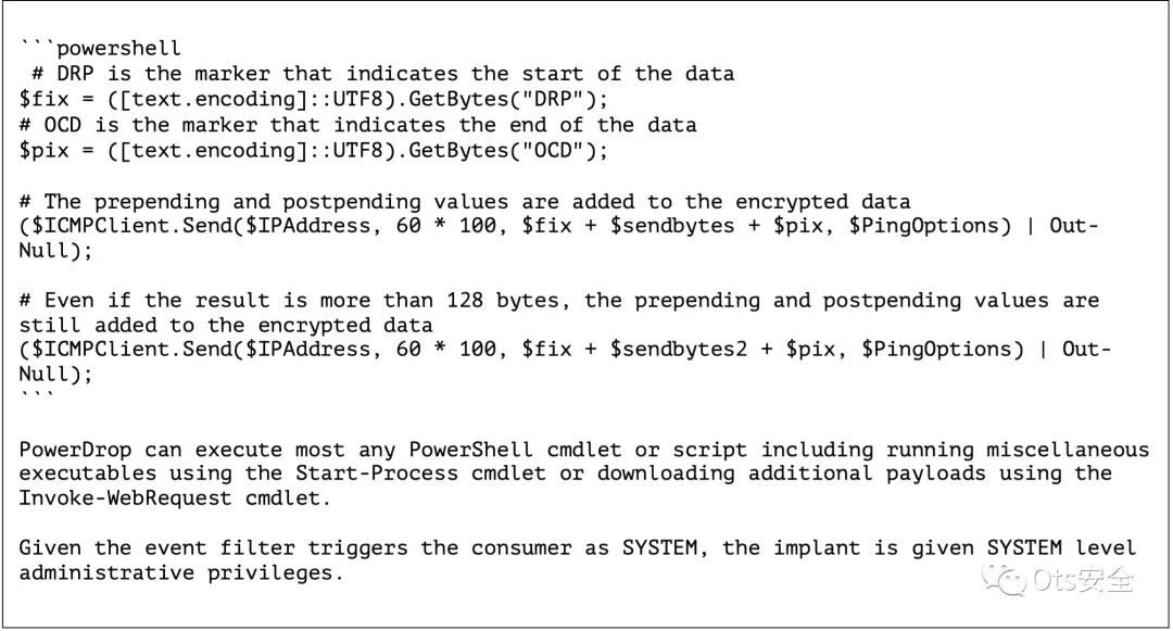 PowerDrop 使用字符串“DRP”和“OCD”作为前置和后置值,为 C2 服务器的响应内容添加书签。prepending 和 postpending 值用于指示响应内容的开始和结束。