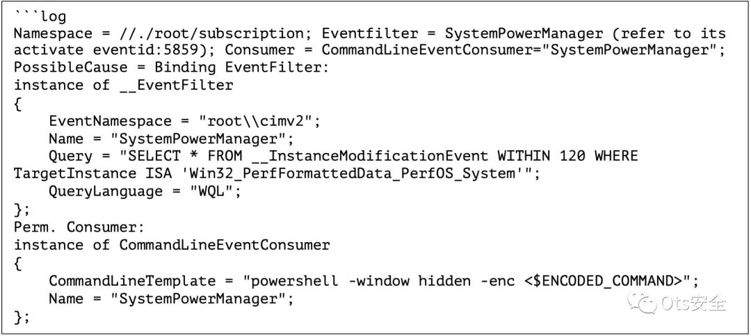 在许多其他恶意软件系列中都可以看到用于持久化和执行 PowerShell 负载的 WMI 过滤器和消费者注册,以及使用 PerfOS_System WMI 类作为执行的可靠触发器。