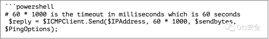 发送信标后,受害机器将等待 60 秒以等待响应。此 60 秒的驻留时间不同于 Windows 上 ICMP 回显请求消息的典型默认 10 秒请求超时。这很可能确保恶意软件可以从 C2 服务器接收响应,即使网络正在经历高延迟或数据包丢失,尤其是在没有保证 ICMP 回显请求消息的交付或确认的情况下。