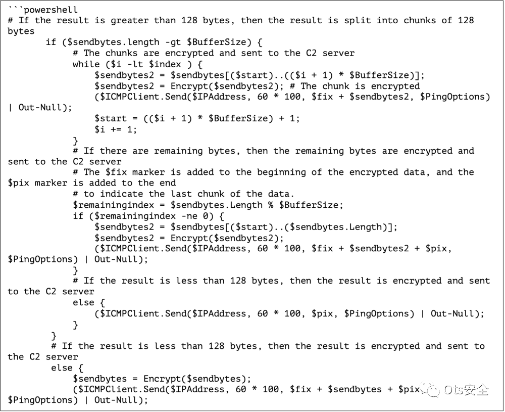任何超过 128 字节的超大响应都将拆分为多条消息。第一条消息与响应的前 128 个字节一起发送,后续消息与响应的剩余字节一起以 128 字节块的形式发送。C2 服务器负责重组响应: