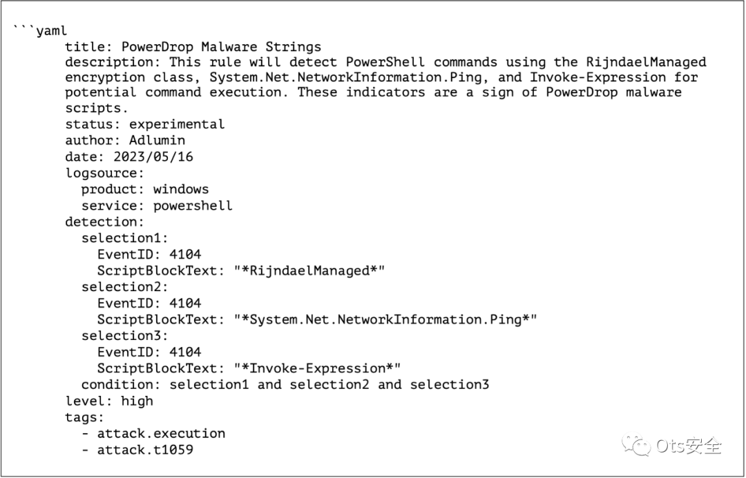 此 SIGMA 检测通过 PowerDrop 恶意软件的未编码和必需组件的 PowerShell 脚本块识别 PowerShell 执行: