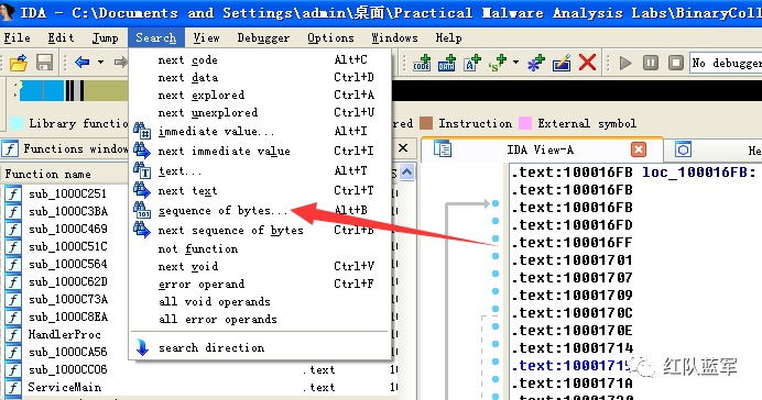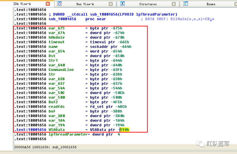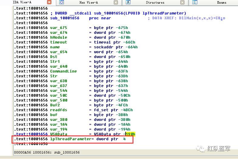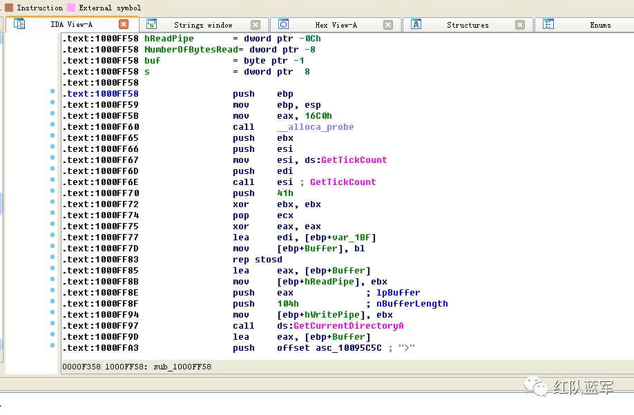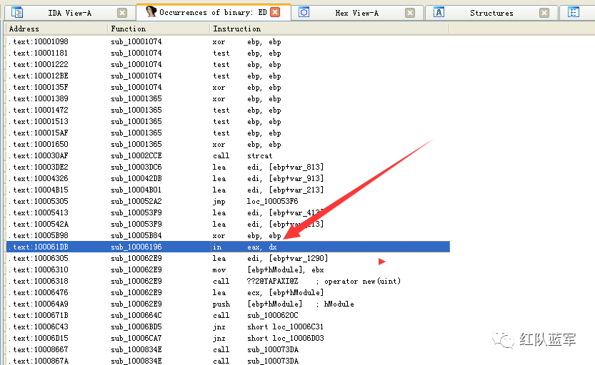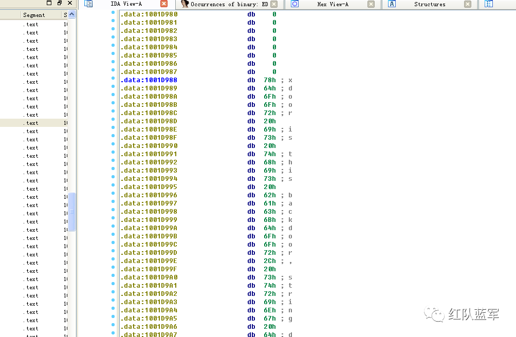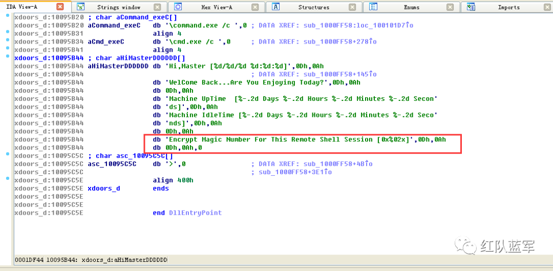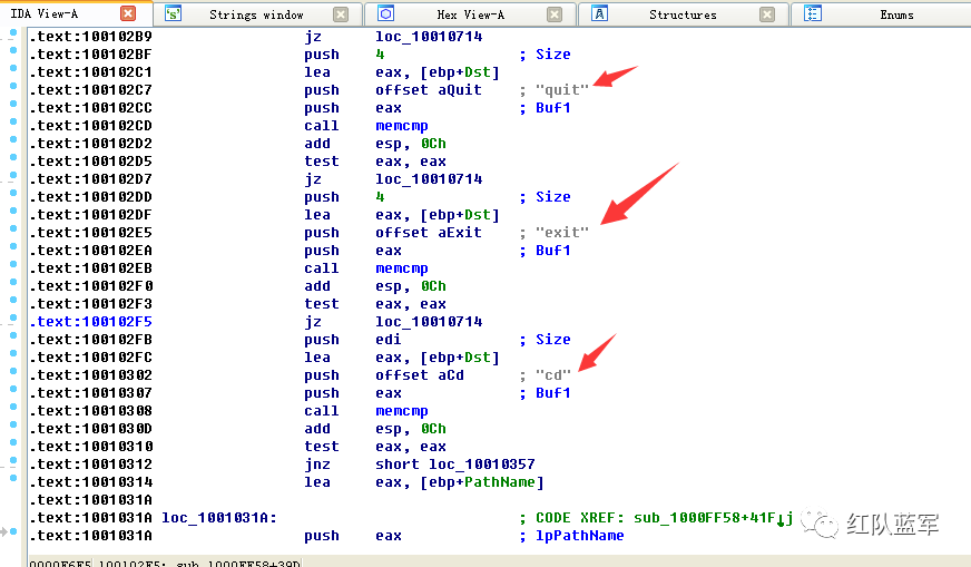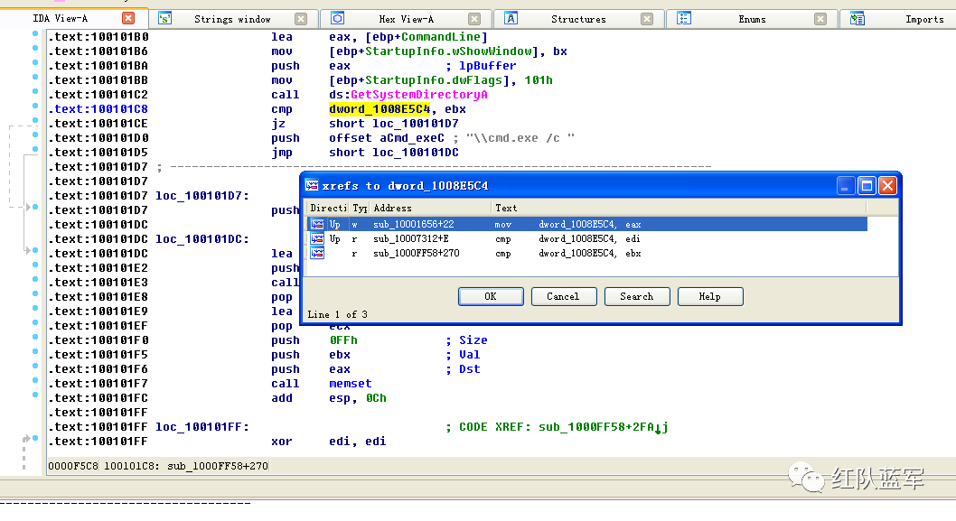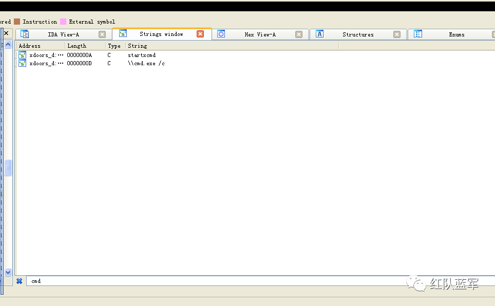 shift+f12 跳转到strings窗口,然后搜索cmd即可,跟进去得到0x10095B34