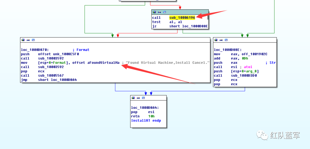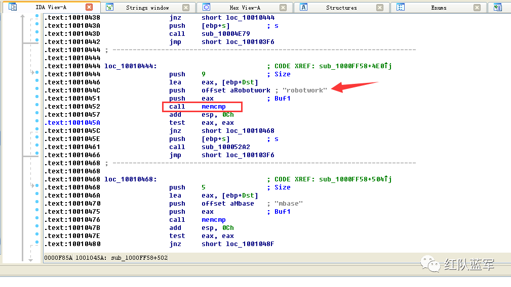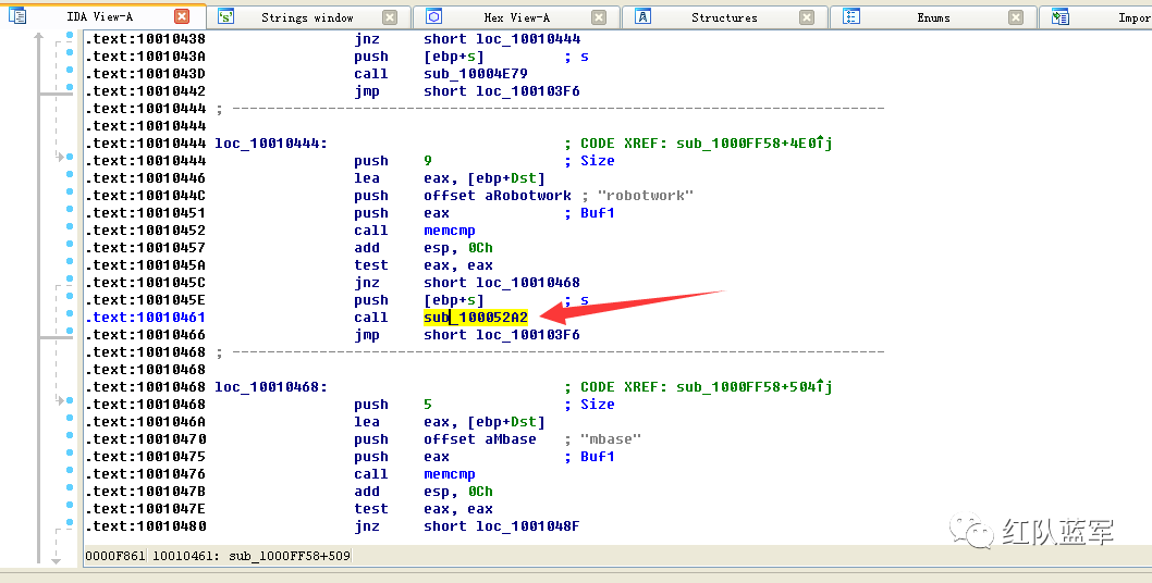 题目设memcmp返回0则不跳转,调用sub_100052A2函数