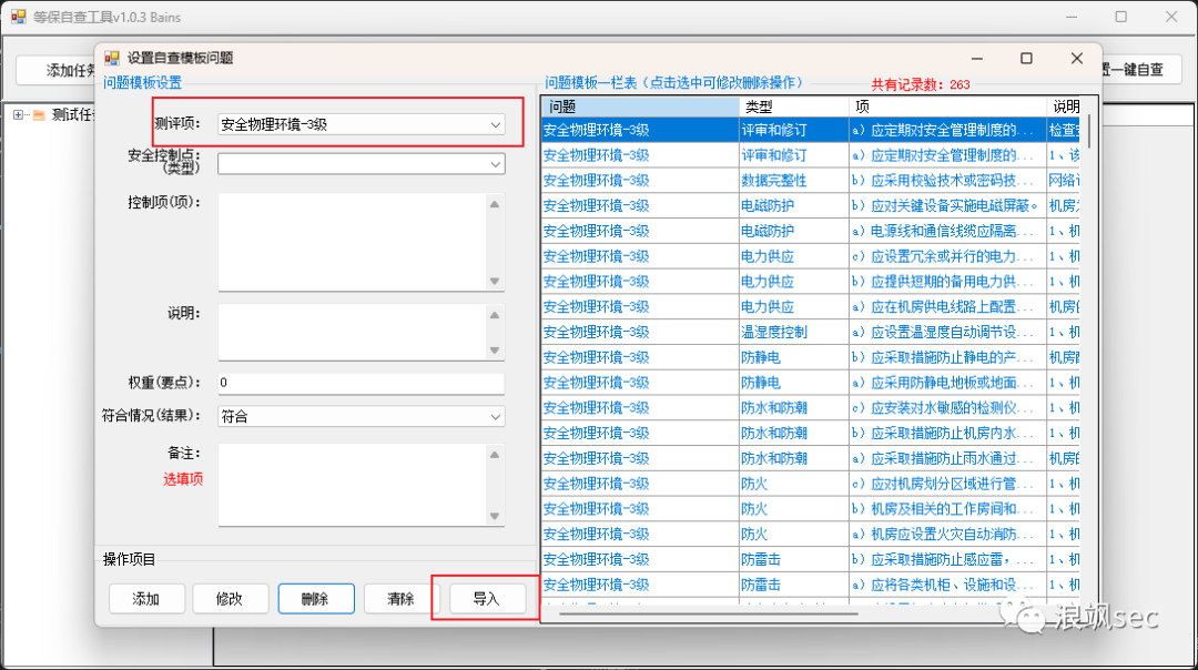 设置自查模板问题处增加导入功能,选择要导入的测评项,然后点击导入按钮即可,类型即安全控制点没有会自动添加。注意:务必按照文件里excel模板去导入,软件没有判定导入内容,出错概不负责。