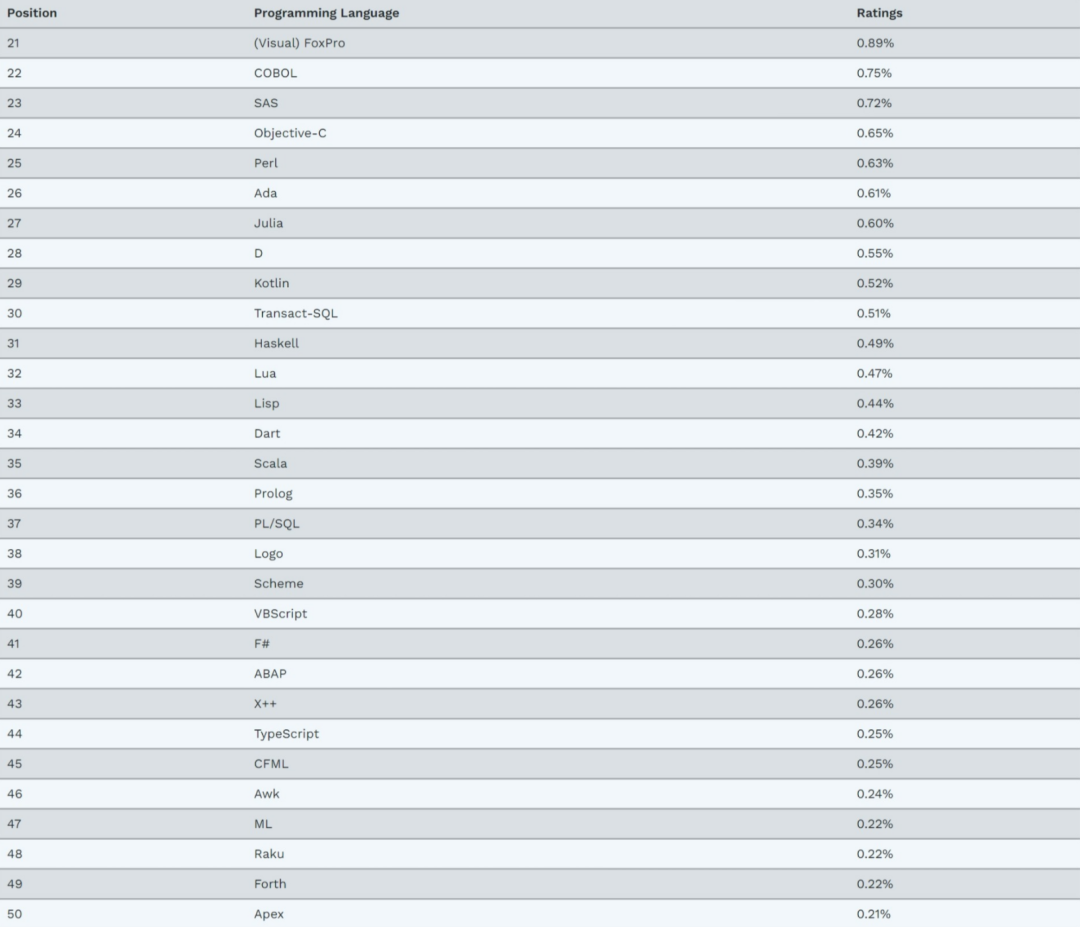 除了这场争夺第一名的斗争之外,本月 Top 21-50 榜单中,也出现了两个新面孔:X++(Microsoft Dynamics 使用的语言,类似于 Java 和 C#,是一种区分大小写的语言)和 Raku(Perl 的分支/继承者,原名 Perl 6,是 Perl 编程语言家族成员之一)。