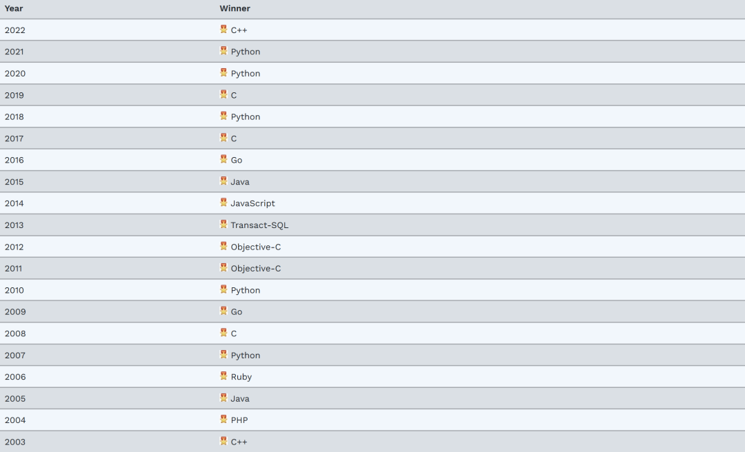 编程语言的流行度,除却易用性和速度等自身特质,其主要应用领域的发展也是重要影响因素之一。过去几年,由于数据科学和 AI 领域的推动,Python 越来越受欢迎,共拿下 5 次 TIOBE 年度编程语言的宝座,自 2021 年 10 月起,更是挤下了 C 和 Java,自此长期霸占着榜单第一。