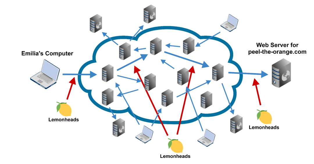 上图是全球Tor网络中,使用者和监控者的示意图。Emilia代表使用者,Lemonheads代表监控者。当使用者使用Tor时,监控者只能观察到使用者与入口节点的连接。即使他们对所传递的消息有完全的全局可见性,他们也很难跟踪使用者的消息,因为它们混入了所有Tor用户的流量,而且每次消息传递到另一个节点时,加密层都会发生变化。如前所述,如果使用者使用单一的 VPN 提供商,它将知道使用者访问的网站。此外,监控者可以观察来自 VPN 服务器的传入和传出消息,并可能确定使用者正在访问哪些网站。