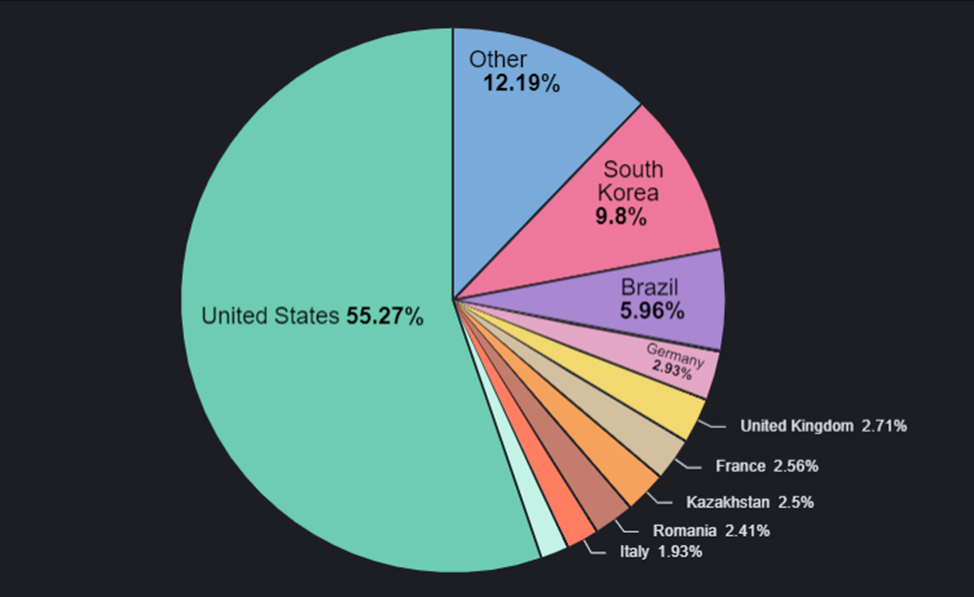 受影响的设备中,55.27%位于美国。其次是韩国和巴西,分别占9.8%和5.96%。接下来的几名分别是英国、法国、哈萨克斯坦、罗马尼亚和意大利。