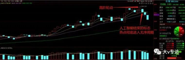 大家知道热点是在哪一天进入无序周期的吗?时间拉回到5月11号,当天传媒走了一个高阶轮动,底部的很多传媒股涨停。以往的高阶轮动,市场会重新再来一波行情,从传媒的k线来看,那天走势也很有诱惑性,板块创下新高,很多人都大喊新的一波。但是,还记得吗,那天的复盘里我没有把人工智能定义为强赚钱周期,而是弱赚钱周期。那天传媒的大涨,就是末日轮狂奔,给人工智能画上一个句号。