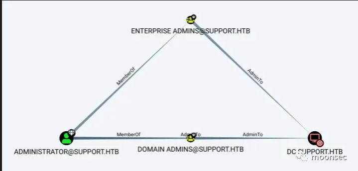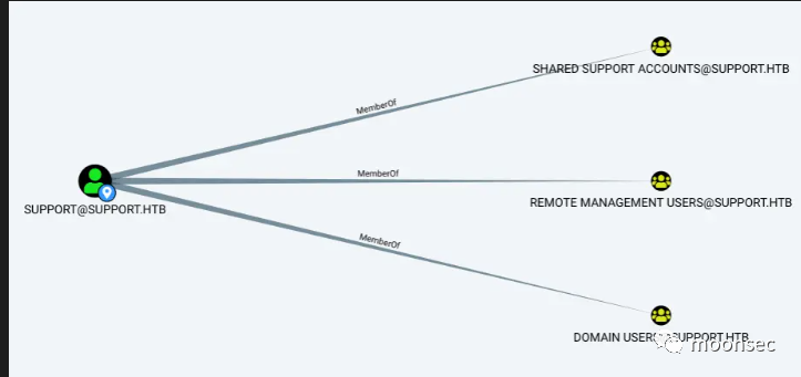 再次查看 Bloodhound 数据,支持用户是 Shared Support Accounts 组的成员,该组GenericAll在计算机对象上具有 DC.SUPPORT.HTB: