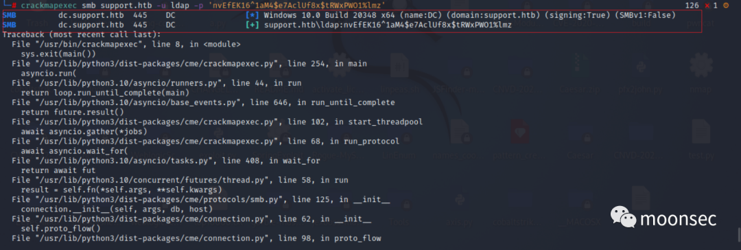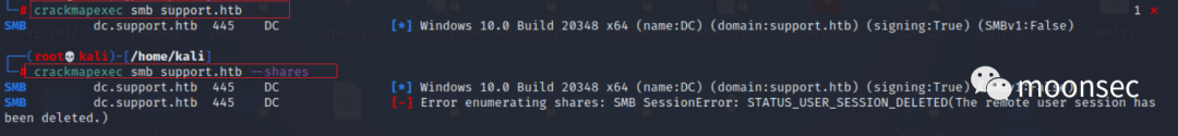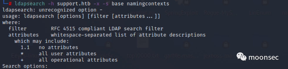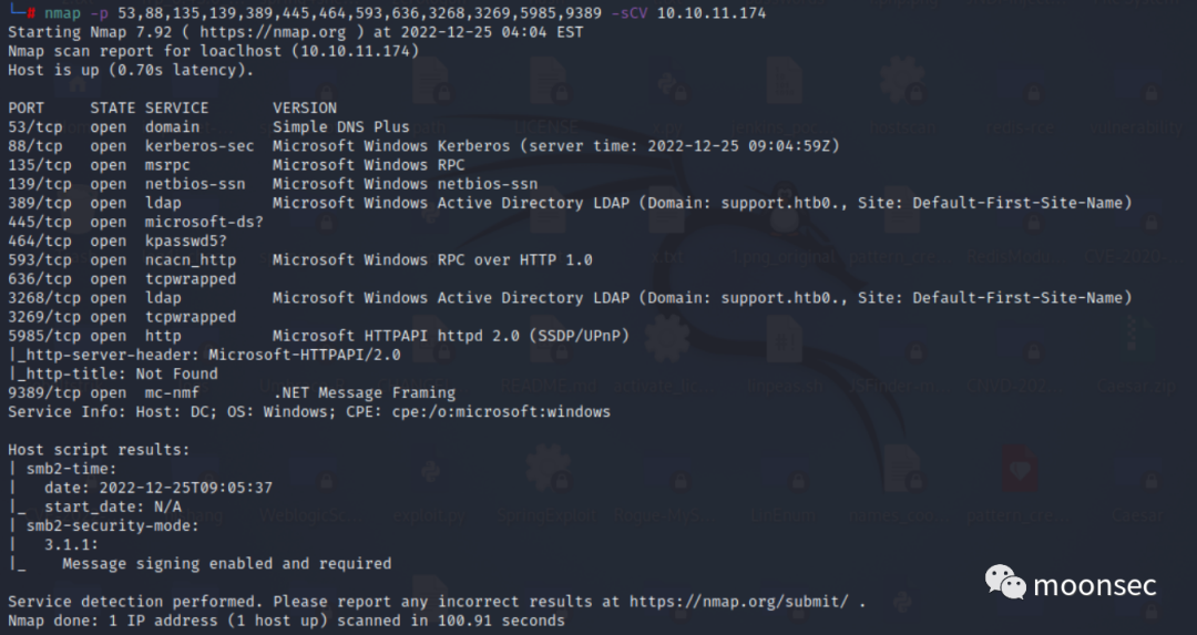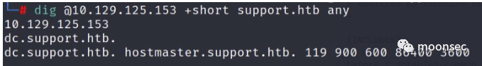 我们的 dig 命令确认服务器的计算机名称是“dc”,域名是“support.htb”。