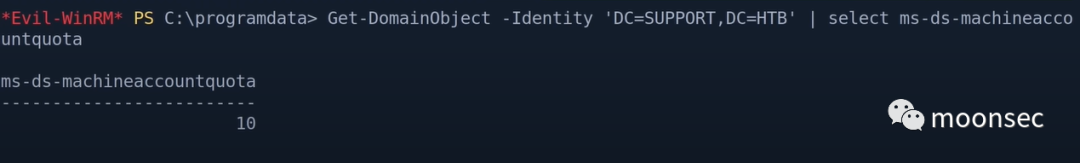 我要滥用基于资源的约束委派。首先,我将在我控制的域中添加一台假计算机。然后我可以作为 DC 为假计算机请求 Kerberos 票证,从而能够模拟其他帐户,如管理员。为此,我需要一个可以将机器添加到域中的经过身份验证的用户(默认情况下,任何用户最多可以添加 10 个)。这是在ms-ds-machineaccountquota属性中配置的,它需要大于 0。最后,我需要对加入域的计算机(GenericALL在 DC 上得到我)的写入权限。