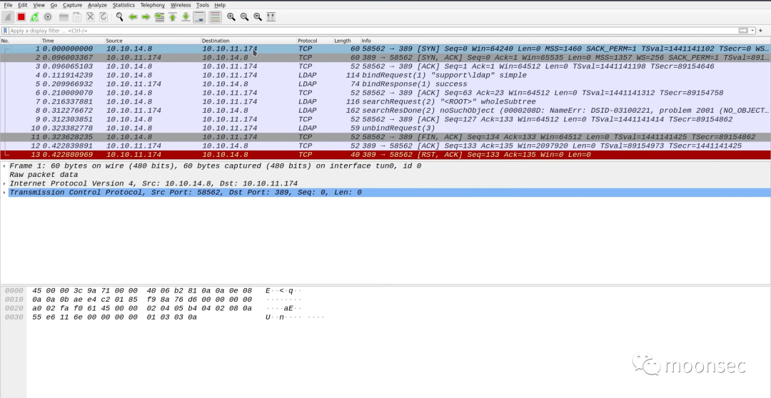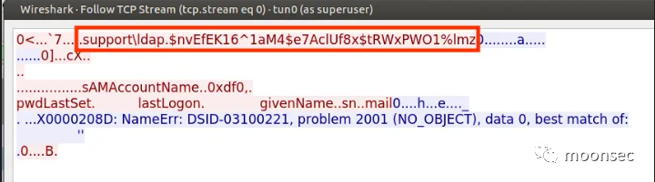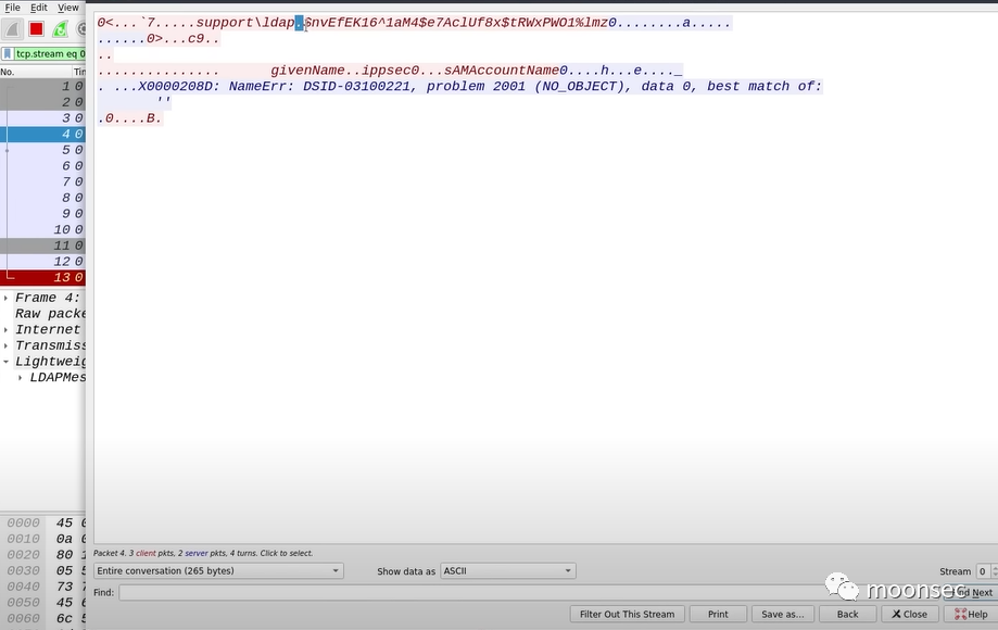 在我的 Linux 系统上,我已经安装了 .NET 框架,它与mono二进制文件一起提供,也可以用来运行这个二进制文件。如果我打开 Wireshark 并运行二进制文件,我将在 LDAP 流中捕获身份验证:
